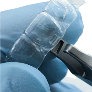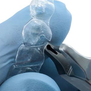 El alicate «GOTA DE AGUA» de la casa alemana OSCIDENT hace un corte en el borde gingival del alineador o retenedor, justo donde se requieren ganchos elásticos, facilitando un espacio para que los elásticos permanezcan en su lugar cuando se coloca el alineador, permitiendo una mayor facilidad al paciente a la hora de cambiar los elásticos.