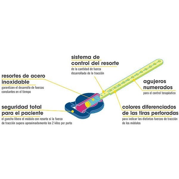 Este sistema elimina el peligro causado por el desenganche del arco extraoral del tubo, evitando asà el violento efecto «tirachinas». Los resortes en espiral presentes en el interior del módulo realizan fuerzas constantes en el tiempo.