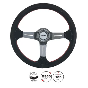 Volante Grinta negro Cuero ecológico negro con costuras negras, diámetro 350 mm. Volante Grinta negro Cuero ecológico negro con costuras negras, diámetro 350 mm. El volante de un coche tiene una función muy importante: es el primer punto de contacto entre el conductor y el vehÃculo. De hecho, el control del coche depende del volante y el agarre debe ser firme con buen confort para una conducción suave y segura. Los volantes Simoni Racing han sido diseñados para mejorar el agarre y aumentar la precisión de uso con un diseño de mango anatómico. Gracias al uso de materiales de alta calidad, se garantiza un aspecto deportivo y agresivo. Dependiendo del coche donde lo vayas a instalar, necesitarás: Evaluar el tamaño total del volante original y elegir el diámetro adecuado Adquirir el buje especÃfico para cada coche Evaluar la inserción de un quick release o espaciador para una posición de conducción óptima